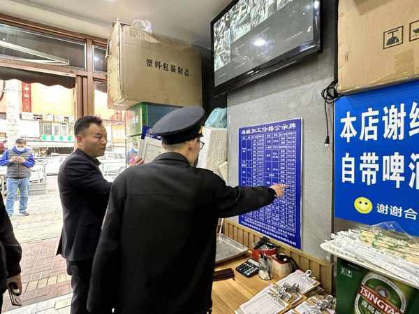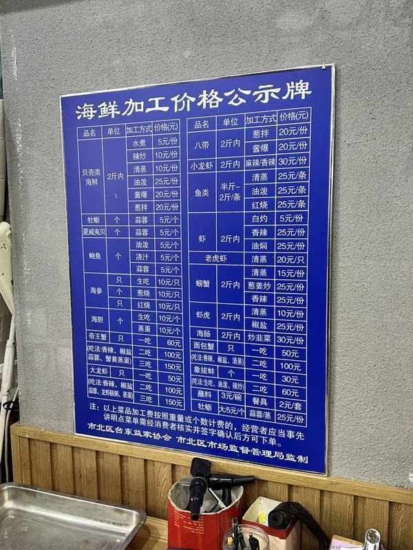 “我們這個海鮮加工價格公示牌是全國首創,周邊300多傢啤酒屋統一明碼標價。”臺東街道市場監管所四級主辦王鳳鳴介紹,過去每到旅遊季,營口路市場周邊的海鮮加工投訴集中,主要集中在價格上,2021年,由市北區臺東益傢協會、市北區市場監督管理局監制的《海鮮加工價格公示牌》集體“上墻”,從此再無價格投訴。