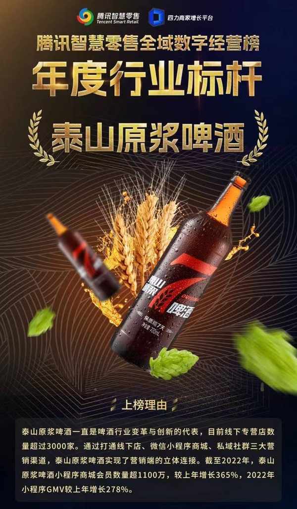 騰訊智慧零售推出的“全域數字經營榜”,所衡量的核心指標是圍繞品牌數字化生態體系建設來展開,而泰山原漿啤酒在運用數字化轉型成果和智慧型管理體系重塑煥新高效組織力方面,持續取得突破性進展,因此榮登本屆榜單可謂實至名歸。