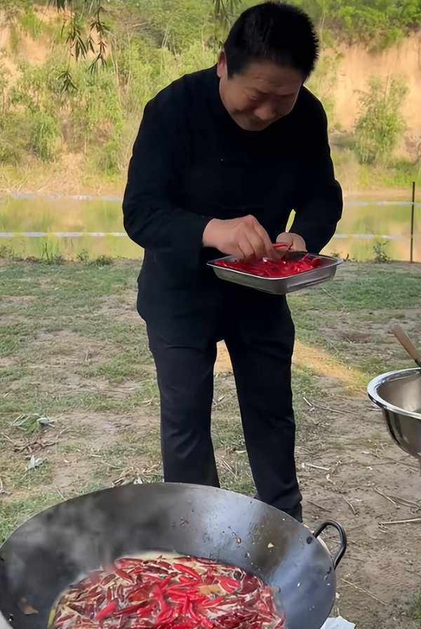 挑戰項目開始之後,隻見李永志一手提著一瓶二鍋頭,另一隻手從大鍋中撈起一把辣椒就往嘴裡送,一番咀嚼之後灌瞭一口白酒咽下瞭肚,看上去非常的過癮。