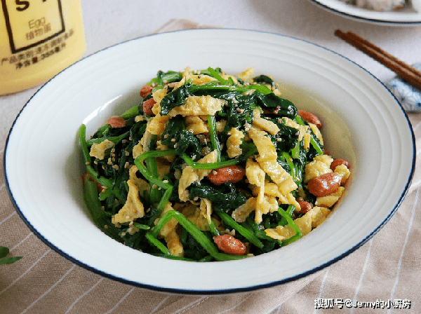另起鍋加油,倒入蛋液,煎成蛋餅,再切成小條;鍋內加水煮開,倒入菠菜,煮四十秒撈出,過涼後擠幹水分。