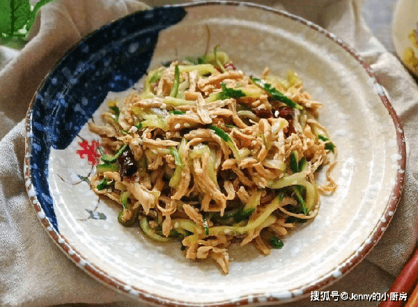 雞胸肉沖洗幹凈,冷水入鍋,加入料酒、薑片,煮到雞胸肉熟透。黃瓜搓洗幹凈,切成細絲。