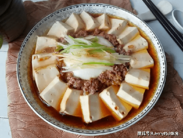 老豆腐沖洗一下,切成小塊,放進盤內,圍成圓形。然後將肉餡放進去,也圍成圓形,為瞭口感好,不要按壓。
