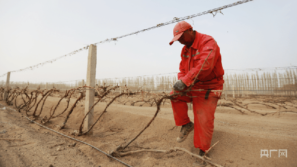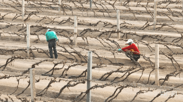 眼下,新疆焉耆縣10萬畝釀酒葡萄出土上架工作正在有序推進,霍拉山腳下的茫茫戈壁灘因為葡萄長廊,煥發出勃勃生機。