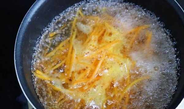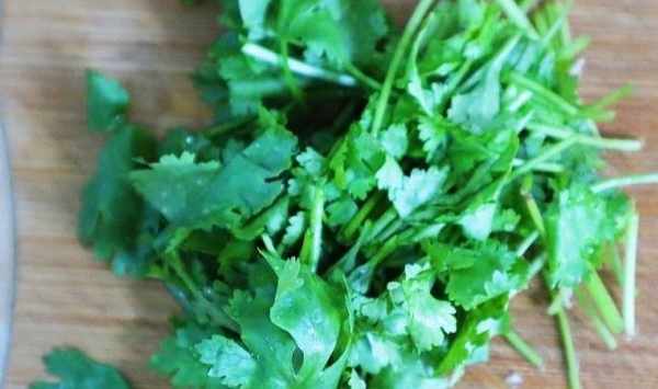 5、鍋中放入玉米油,加入洋蔥,薑,花椒,八角炸香。撈出料,油趁熱澆在蒜末上,放入香菜,加入白醋,攪拌均勻