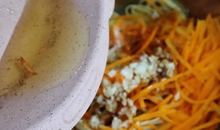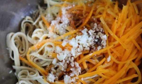 3、豆腐皮切絲,加入焯水的胡蘿卜,放入蒜末,鹽,味極鮮