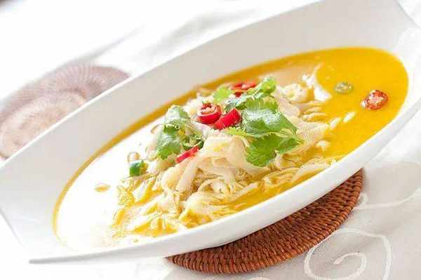 2熱鍋入油,油溫六成後,下薑片、蒜片,藤椒,山椒爆香後,加入海南黃燈籠辣椒醬(100g,一大勺)翻炒一分鐘後加入高湯(沒有高湯,也可以加適量水和一個嘉樂牌濃湯寶),糯米酒,調勻大火煮開。加白醋,糖,鹽調味。