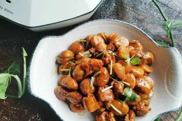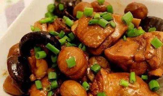5.再加適量清水大火燒開,轉小火把雞塊燜至7成熟。放入栗子繼續煮,至雞塊和栗子酥爛,用旺火收汁,留少許湯汁關火