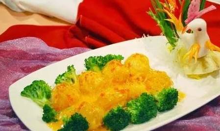3、熱油,把雞蛋液倒入,像炒滑蛋那樣的做法炒雞蛋,顏色變金黃色就是所謂的蟹黃瞭,盛盤把蟹黃放圓盤中間,有利於擺盤。