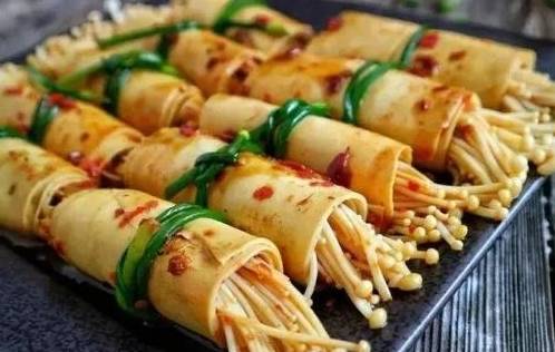 2.取適量金針蘑,將培根肉從裡向外卷起