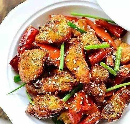 雞肉400克、幹辣椒4個、蔥1棵、薑5片、花椒適量、鹽1茶匙、糖適量、生抽1勺、老抽半勺、料酒1勺、香蔥1棵、白芝麻適量、花生油200克