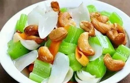 2、鍋內放3勺油,冷油放入腰果,炸到金黃酥脆後撈出放涼;鍋內留底油先放入芹菜大火翻炒約1分鐘。