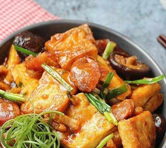 4.加入六月鮮有機醬油炒勻,再加入適量水或者高湯沒過材料,煮開轉小火熬至湯汁收濃,澆在煎豆腐上即可;