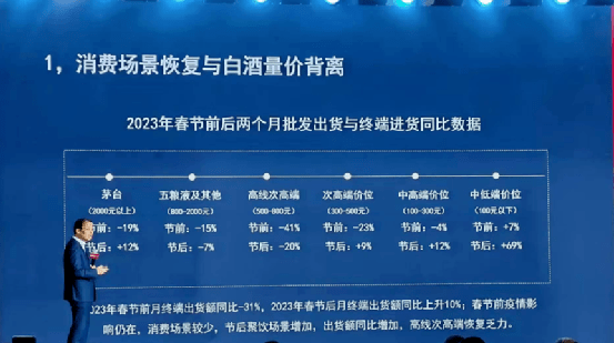 值得關註的是,大會提到800-2000元價格區間的節後銷售下滑7%,這與多數調研數據反饋及五糧液動銷20%以上正增長有很大出入。主要原因是疫情放開後,人們對白酒復蘇的心理預期過高,實際上白酒消費復蘇並未如預期那樣順利。