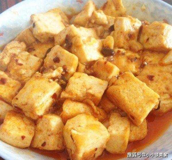 老幹媽炸豆腐:將豆腐瀝幹,切塊。(也可以用開水焯一下。)鍋裡放油燒熱,加入老幹媽醬,小火炒熟,加入豆腐塊和少許高湯大火煮,最好翻炒一下。搖動鍋。以免豆腐粘鍋。不要使用抹刀混合。豆腐太多會影響外觀和口感。最後將醬汁勾芡,淋上少許香油即可。
