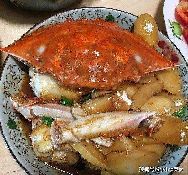 薑餅蟹:將漂浮的螃蟹洗凈切塊(每塊4塊),稍瀝幹水,切塊蘸幹淀粉待用;油熱鍋,將浮蟹煎至表面微焦,撈出,放入鍋中留底油,將薑片炒香,將炸好的蟹搖回鍋中;倒入料酒,加入醬油和白糖,蓋上1小碗水,蓋上大火煮2分鐘,然後加入年糕,待年糕變軟,湯汁變稠時,撒上蔥,然後從鍋中取出。