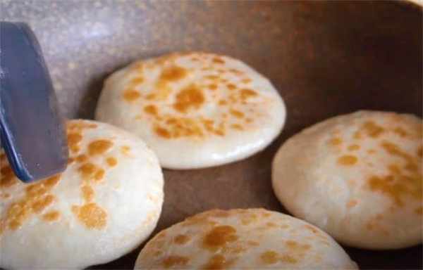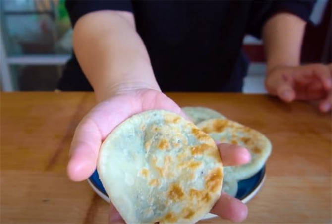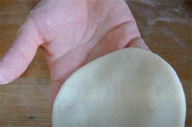 5.中間包上糖餡,把收口處給封緊瞭,在掌心團一下按扁,搟成這樣的大小,咱們直接去烙。