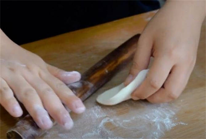 3.取出來一個面劑,稍微的揉勻揉圓瞭,案板上撒些幹面粉,直接按扁,搟成中間厚四周薄的餅皮。