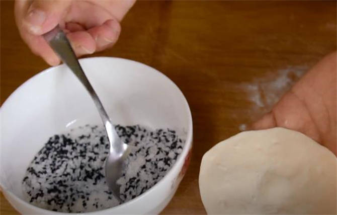 4.這個是剛才調好的糖餡,白糖裡面摻點黑芝麻,這樣更香一些。