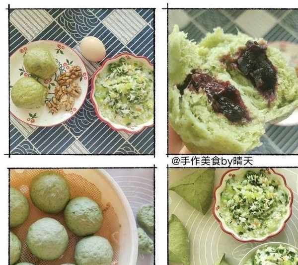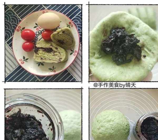 【蔬菜面包桑葚醬餡】:用春天的野菜揉面,發酵好之後放入自制桑葚醬作餡。