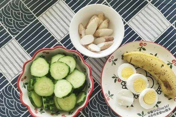 【Day5】開啟5月小長假,今天不想做早餐,快速懶人早餐就這個樣,香蕉1根,煮雞蛋1個,蒸山藥1小碗,黃瓜1根。