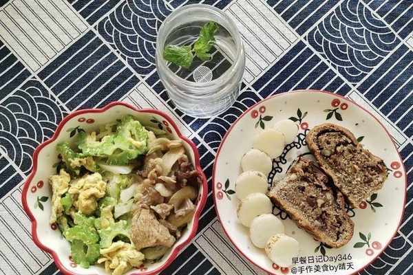 【Day4】今天的陽光早餐,1杯清茶+薄荷,全麥紅棗核桃面包2片,蒸山藥,1碗肉菜拼碗(苦瓜炒蛋/炒包菜/羊肉)