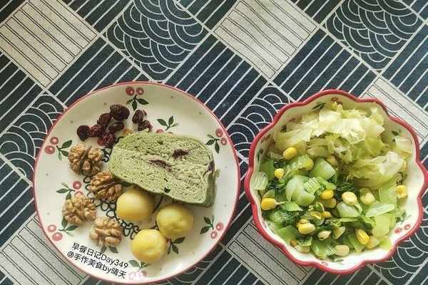 【Day7】面包1切塊,核桃仁4個,蔓越莓幹1把,土豆3個,蔬菜1拼碗(青菜/包菜/玉米粒)