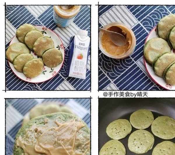 【松餅】食材:鼠曲草汁100g,雞蛋1-2個,面粉適量,泡打粉3g,牛奶酌情添加或否,玉米油10g。松餅夾餡抹醬:花生醬,也可以其他果醬就是不同味道。