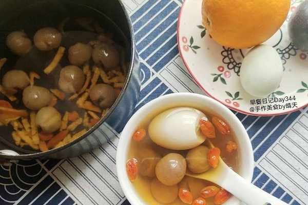 【Day2】16小時斷食後的早餐即午餐,正餐前的茶飲,喝2杯陳皮桂圓雞蛋茶,桂圓幹15顆,陳皮1掌,煮熟雞蛋1個,枸杞幹1撮,紅糖選用,減脂期戒糖不放糖,喝瞭茶再吃碳水主食及水果。