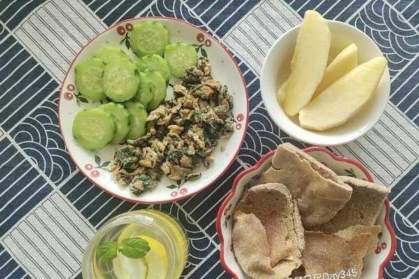 【Day3】薄荷炒雞蛋(2個雞蛋,1把薄荷葉)全麥口袋餅烙餅1個,檸檬泡水1杯,黃瓜半根,蘋果半個。