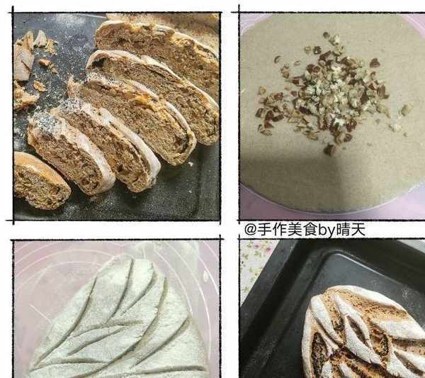 【全麥面包紅棗核桃餡】:全麥粉+牛奶,酵母粉,混合揉面團,發酵至1.5倍大,再搟成圓片,放上切碎的花生核桃仁,像包包子一樣收口封閉,收口朝下放置,在表面撒上幹粉,再割出花紋後進行二次發酵至1.5倍大,入預熱好的烤箱,180度上下火中層烤35分鐘。