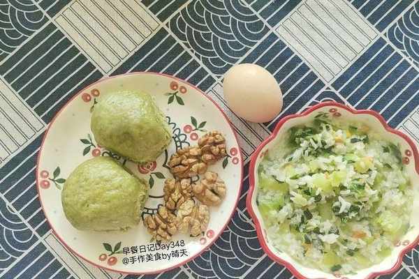 【Day6】菜泡飯1碗,核桃6個,蔬菜饅頭果醬餡2個,煮雞蛋1個。