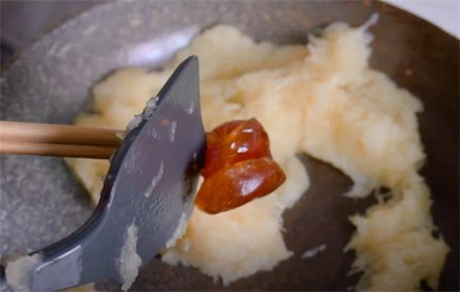 5.咱們一直把這個冬蓉餡炒到顏色焦黃,不粘鏟子,抱團的狀態就行瞭。