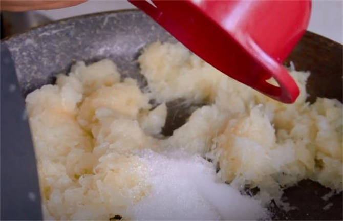 3.擠好水分後,咱們直接放在不粘鍋裡,加20g黃油進去,開小火不停的翻炒,沒有黃油的話可以換成玉米油,咱們把這個黃油炒到融化之後,50g的白糖放進去。