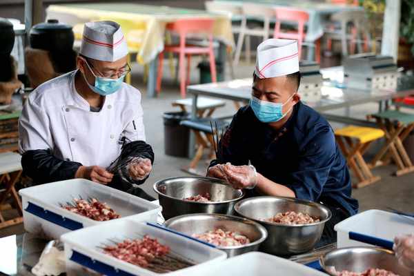 ↑一傢燒烤店的廚師正在串肉串 圖據視覺中國