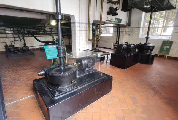 隨後進入釀造工藝發展展區。在1903年的糖化車間,薑衛說:“糖化車間分為兩層,一樓所展示的是電機和鍋的底部,電機的作用就是帶動鍋裡的攪拌槳進行原料攪拌。我們眼前這臺電機產於1896年,現在通電後還可以正常運轉。”新中國成立後,經過青啤的創新發展,電機得到瞭很好的維護保養,成為中國啤酒工業百年歷史的最好見證。