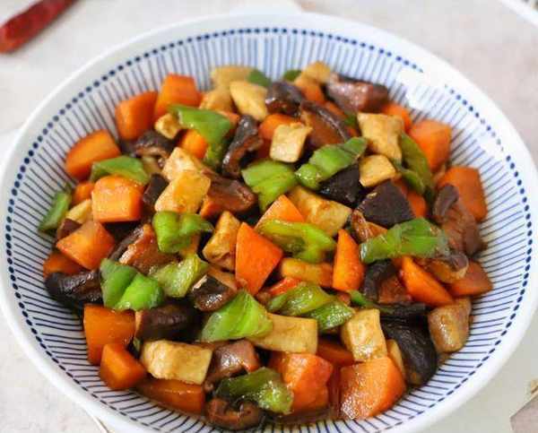 做法:1、幹香菇用溫水泡發後切成小塊,胡蘿卜去皮滾刀切塊,青椒去籽洗凈後也切成小塊。