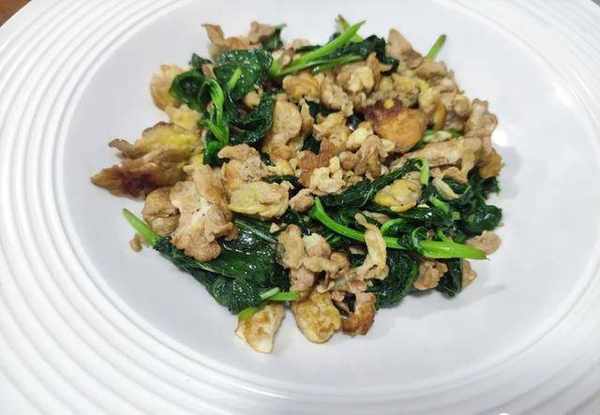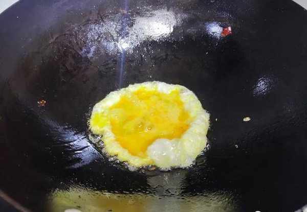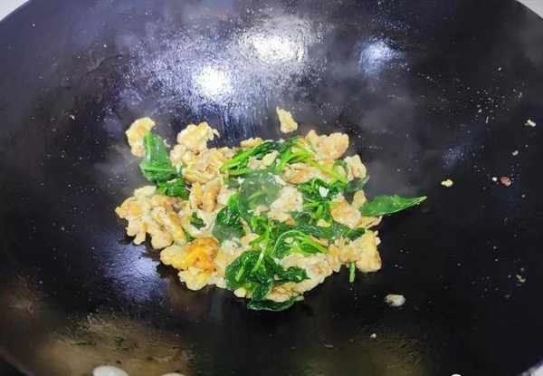 鍋裡面的雞蛋煎至成塊瞭之後,我們就把備好的薄荷葉下鍋。薄荷葉中含有水分也是非常高,下鍋後在鍋旁邊再加一點點的食用油,然後用鏟子快速翻炒,炒均勻,炒個10來秒鐘裡面的薄荷葉葉炒至發軟;