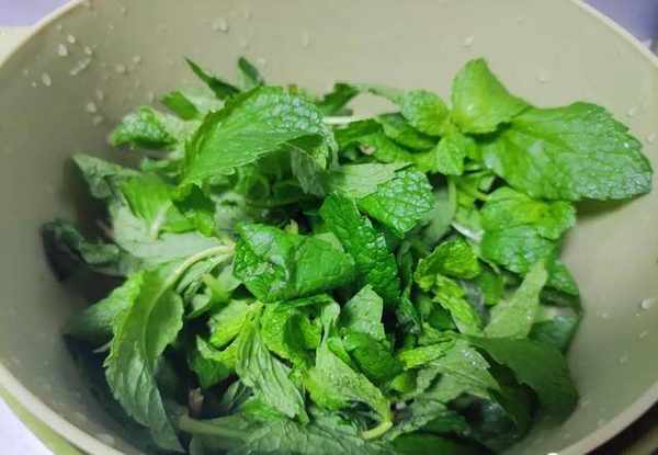 1.將備好的薄荷葉放在清水中沖洗幹凈,洗薄荷的時候一定註意看下,有一些會有泥土覆蓋在葉子上面,要沖洗幹凈。薄荷葉會有一種非常濃鬱的香味,所以比較會少有蟲害,洗幹凈之後的薄荷放在一旁瀝幹水分;