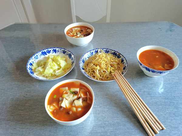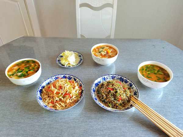 牛肉土豆揪面片,拌黃豆芽,拌蓮花菜。