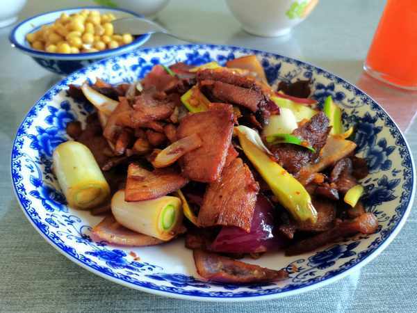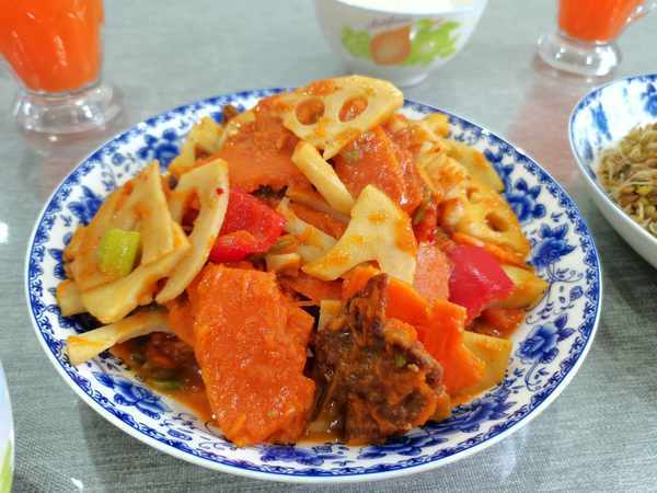 一塊南瓜,半根蓮藕,一塊牛肉,半根紅辣椒,就炒成瞭一盤菜。