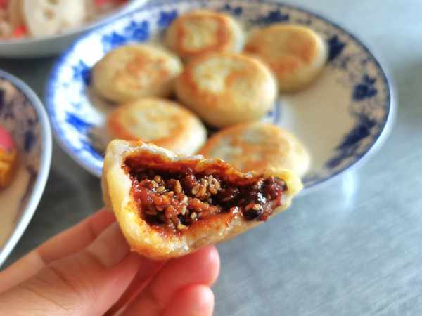 把以上食材攪拌均勻,就是糖餡料瞭,拿一個面劑子,用手壓扁,包上糖餡料,放煎鍋裡面煎至兩面金黃出鍋。