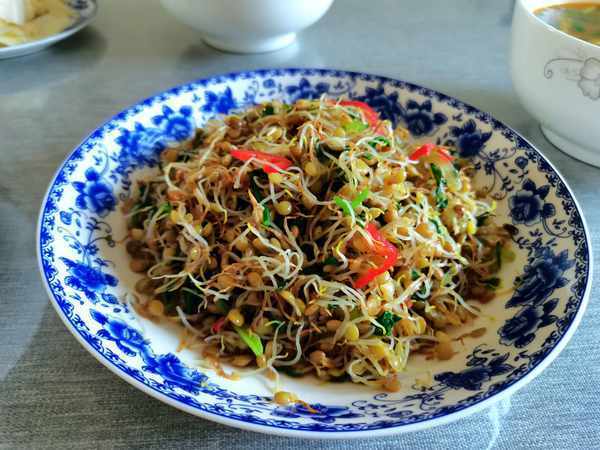 扁豆芽焯水,放紅辣椒絲、香菜,一把蒜末,用熱花椒油潑一下,撒半勺鹽、幾滴味極鮮、兩勺香醋,攪拌均勻,吃一口,鮮香美味。