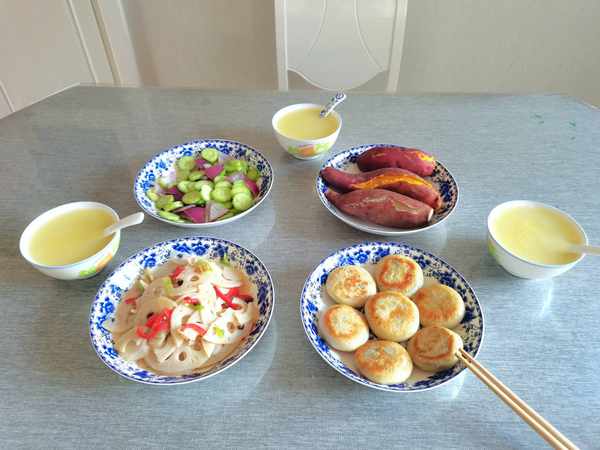 糯米糖餡餅,蒜泥藕片,拌雜蔬,蒸紅薯,大米小米稀飯。