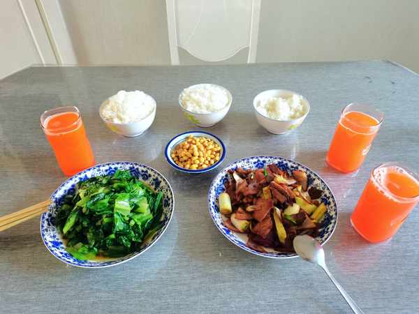 炒扁豆芽,牛肉炒蓮藕南瓜,紅蘿卜汁,米飯。