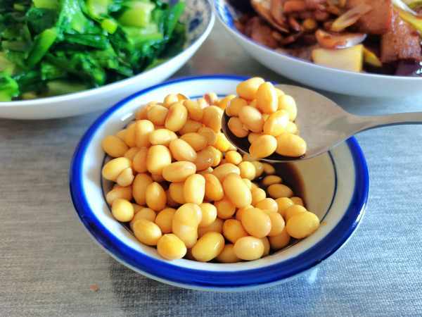 提前泡好的黃豆,早晨沒有打豆漿,晚餐就把黃豆煮熟,倒入一些香醋,一點味極鮮,浸泡10分鐘左右,吃著酸爽可口。