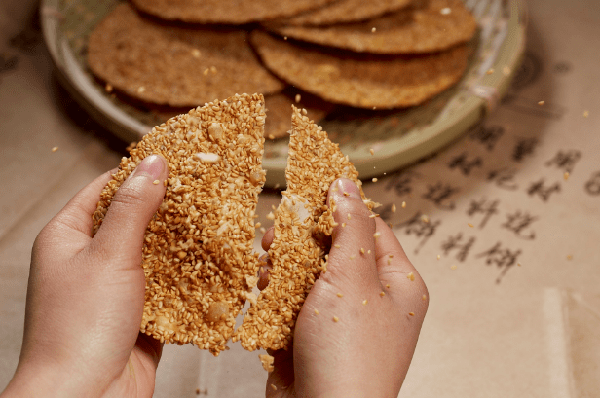 隻用輕咬一口,伴隨著“咔嚓”一聲,一大塊燒餅便落入口中。細細咀嚼,芝麻的香氣包裹著回甘的面香,香滿口腹,讓人停不下來。