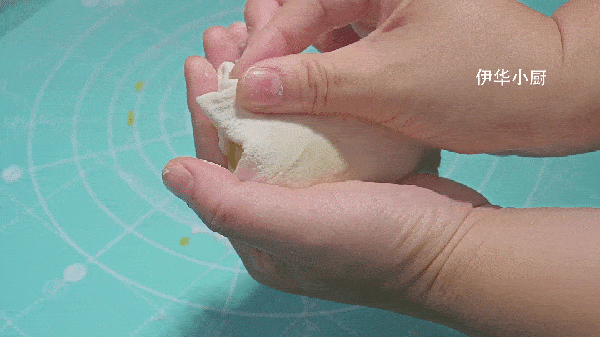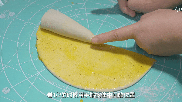 然後繼續把它卷起來,接口處用手指往裡按一按,這樣流出來的油酥就被包裡面瞭
