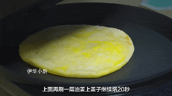 14、大概烙40秒,鍋的四周有熱氣冒出,打開蓋子,頂的表面鼓起大泡,把餅翻個面,上面再刷一層油
