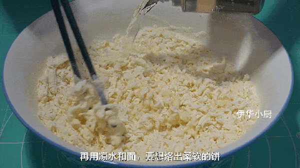 2、再用涼水和面,我們把面攪成團之後,移到面墊上