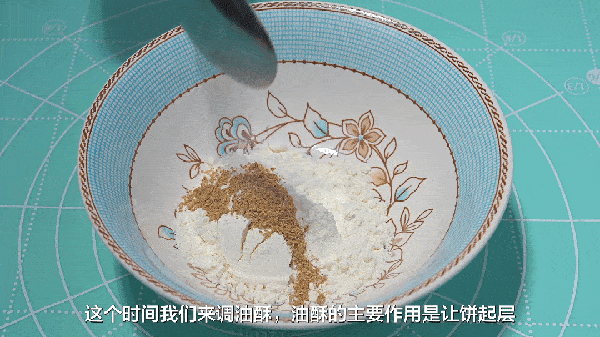7、調油酥:油酥的主要作用是讓餅起層,碗中加入兩勺面粉,來點五香粉,一小勺鹽,倒入適量的食用油,調成酸奶的狀態